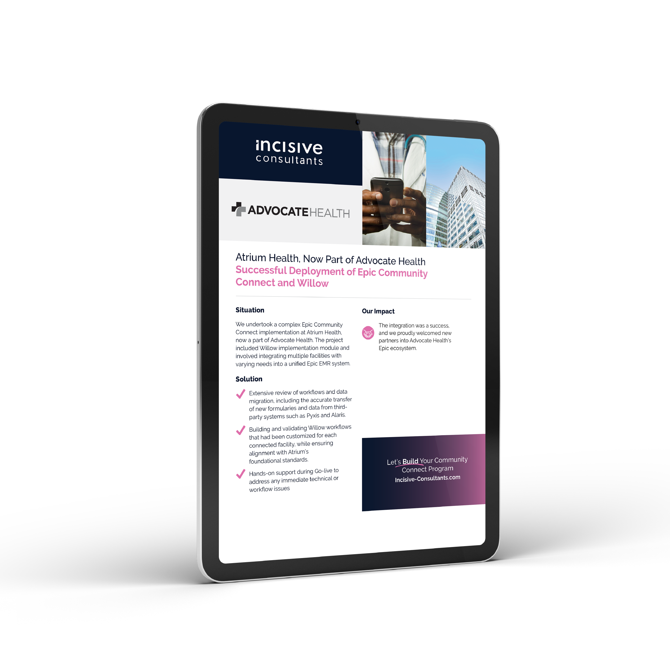 We undertook a complex Epic Community Connect implementation at Atrium Health, now a part of Advocate Health. The project included Willow implementation module and involved integrating multiple facilities with varying needs into a unified Epic EMR system.